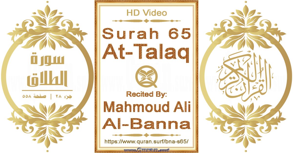- Surah 65 At-Talaq video recited by Mahmoud Ali Al-Banna: www.quran.surf/y/?bna=s65 *