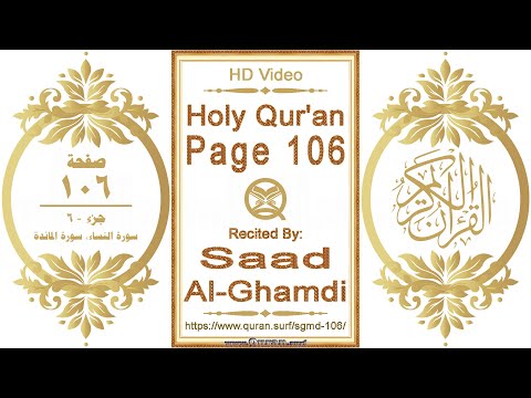 വിശുദ്ധ ഖുർആൻ പേജ് 106 – നിങ്ങളുടെ സ്ക്രീനിൽ മനോഹരമായ രൂപത്തിൽ ഒരു ഹൈ ഡെഫനിഷൻ വീഡിയോ കാഴ്ച. കുട്ടികൾക്കും മറ്റുള്ളവർക്കും ഖുർആൻ പഠിക്കുന്നതിനുള്ള മികച്ച ഒരു രൂപം ഞങ്ങൾ നൽകുന്നു. സഅദ് അൽ ഗാമിദിയുടെ മനോഹരമായ, ഹൃദയസ്പർശിയായ പാരായണത്തോടൊപ്പം ഖുർആനിന്റെ ഭാഗം ഹൈലൈറ് ചെയ്ത് കാണിക്കുന്നു. മുസ്ഹഫിന്റെ പ്രിന്റ് കോപ്പി പ്രകാരം ഖുർആൻ ഫുൾ സ്ക്രീനിൽ കാണുന്നു. വിവിധ പാരായണങ്ങളുടെ താരതമ്യ പഠനത്തിന് പേജ്-ലെവൽ വീഡിയോകൾ വളരെ ഉപയോഗപ്രദമാണ്. ഈ വീഡിയോകൾ ഞങ്ങളുടെ “വേൾഡ് വൈഡ് ഓൺലൈൻ ഖുർആൻ മനഃപാഠ പദ്ധതിയുടെ” (World Wide Online Qur’an Memorization Program) പ്രധാന ഉറവിടമാണ്.