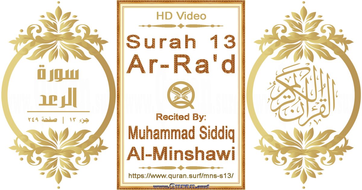 - Surah 13 Ar-Ra’d video recited by Muhammad Siddiq Al-Minshawi: www.quran.surf/y/?mns=s13 *