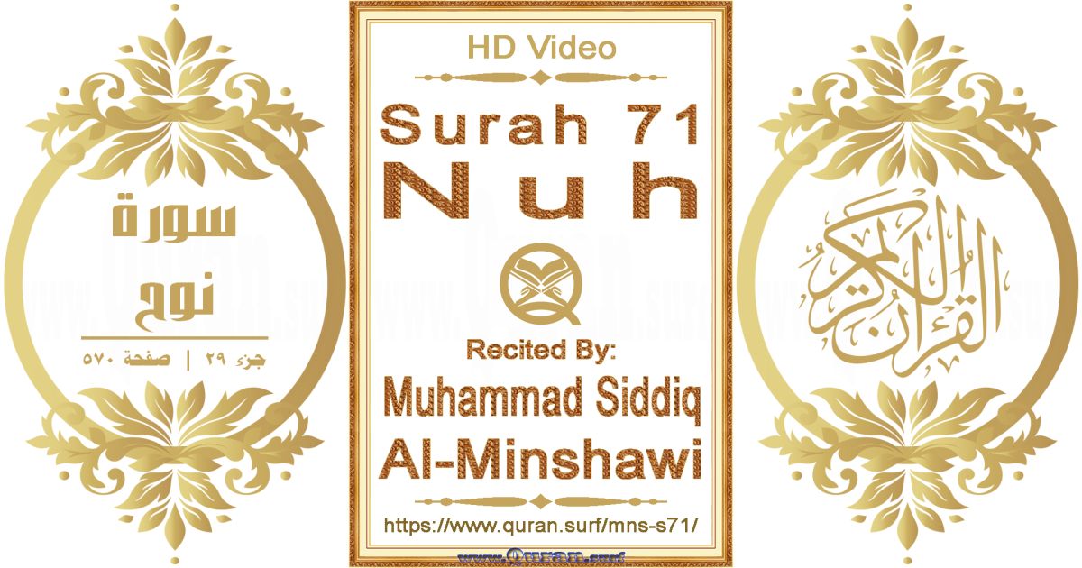 - Surah 71 Nuh video recited by Muhammad Siddiq Al-Minshawi: www.quran.surf/y/?mns=s71 *