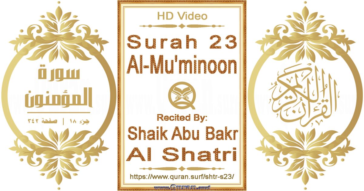 سورة المؤمنون – عرض الفيديو عالي الدقة في شكل جميل على الشاشة. نعطي الأطفال والآخرين طريقة رائعة لتعلم القرآن. ويبرز الفيديو الجزء القرآن الكريم جنبا إلى جنب مع تلاوة جميلة ولمسة القلب شايك أبو بكر الشاطري. القرآن يظهر في كامل الشاشة وفقا للنسخة المطبوعة مصحف.